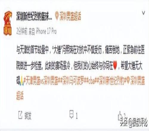 不久前,深圳男篮官方发文:与天津的首节较量中,“大锤”冯熙瑞在对抗中不慎受伤,痛苦倒地,正紧急前往医院做进一步检查。此刻的赛场虽冷,但我们的心始终与你同在[心],希望大锤无大碍。