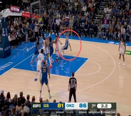今天波神在场上,勇士一般会安排他打低位,雷霆今天切特和哈腾都不打,雷霆一般都会安排小个后卫去错防波神,随时准备包夹。在单打小个的时候,波神也很难展现出碾压级的背身优势,一般都是顶个一两下然后转身投篮。