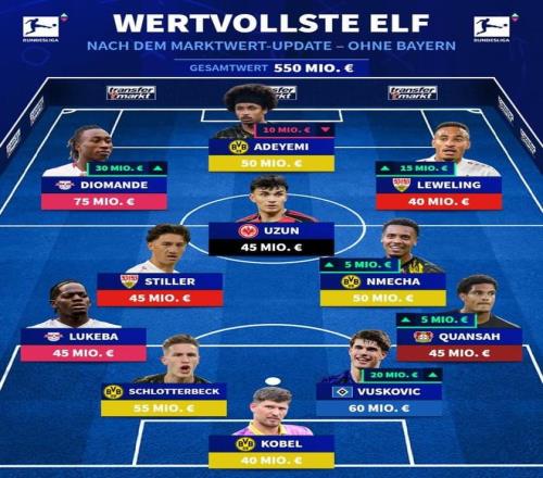 北京时间3月21日,在更新了德甲球员的身价之后,德转还列出了更新之后德甲无拜仁球员的最贵11人阵容,扬-迪奥曼德7500万欧元领衔,阿德耶米、施蒂勒、施洛特贝克入选。