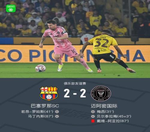 北京时间2月8日俱乐部友谊赛,巴塞罗那SC对阵迈阿密国际。上半场,梅西一条龙破门,之后对手由罗哈斯扳平,补时阶段梅西助攻贝尔泰拉梅再次领先。下半场,比赛尾声阶段阿亚拉染红,之后马丁内斯扳平比分。。最终比分巴塞罗那SC2-2迈阿密国际。