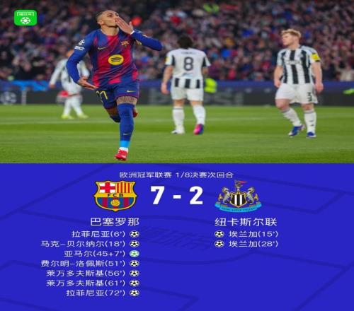 北京时间3月19日1:45,欧冠1/8决赛次回合,巴塞罗那坐镇Spotify诺坎普球场迎战纽卡斯尔联,本场主裁判为勒泰西耶,首回合双方1-1战平。上半场,两队上演进球大战,巴萨这边拉菲尼亚破门+造点,贝尔纳尔、亚马尔建功,纽卡方面埃兰加梅开二度。下半场,费尔明破门,莱万连下两城梅开二度,拉菲尼亚两送助攻后再入一球,托纳利、霍安-加西亚伤退。最终,巴萨主场7-2狂胜纽卡,总比分8-3晋级。