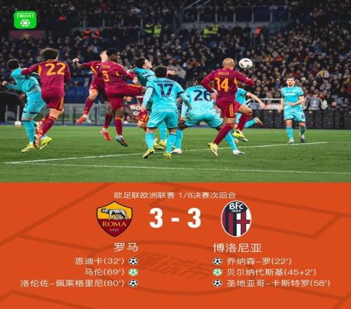 北京时间3月20日欧足联欧洲联赛 1/8决赛次回合,罗马对阵博洛尼亚。罗马恩迪卡破门,洛伦佐-佩莱格里尼破门,马伦破门。博洛尼亚乔纳森-罗破门,圣地亚哥-卡斯特罗破门,贝尔纳代斯基破门。最终比分罗马 3-3 博洛尼亚。两回合总比分罗马4-4博洛尼亚。
