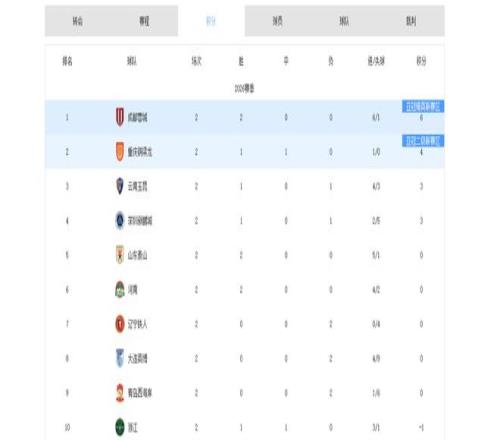 两轮过后,成都蓉城豪取两连胜,净胜5球,净胜球数位列第一,同时以6分成绩领跑积分榜。