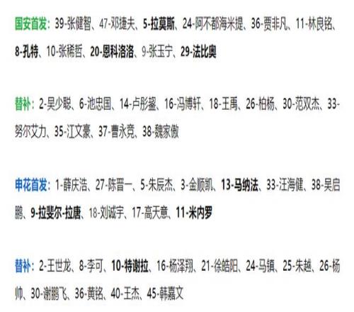 赛前双方首发:法比奥领衔国安四外援出战,张玉宁、张健智、邓捷夫先发,塞尔吉尼奥、王刚缺阵,申花则是三外援先发,分别是米内罗、拉唐、马纳法,另外,吴曦、盖伊因伤没有进入大名单。