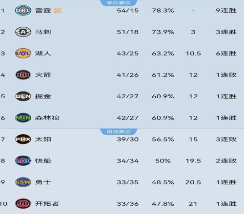 本赛季至今,雷霆战绩为54胜15负高居西部&联盟榜首,马刺51胜18负和湖人43胜25负紧随其后。