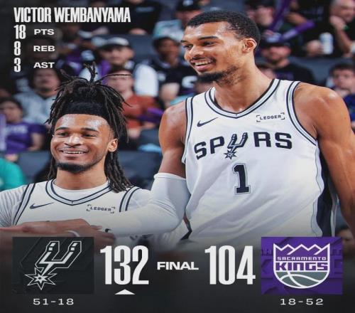 面对西部垫底的国王队,马刺首节39-22直接打花,半场78-47领先31分。马刺13人出战,7人得分上双:文班亚马18分8板3助、凯尔登18分、尚帕尼17分、巴恩斯16分、福克斯15分5板6助、哈珀15分4板5助、沃特斯11分4板。