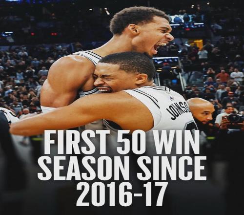 自1976-77赛季ABA和NBA联盟合并以来,马刺已经取得28次单赛季50胜,同期联盟第一。第二是湖人的27次,第三是凯尔特人的22次。截至今天,湖人43胜25负,凯尔特人45胜23负,这两支球队本赛季同样有望拿到50胜。