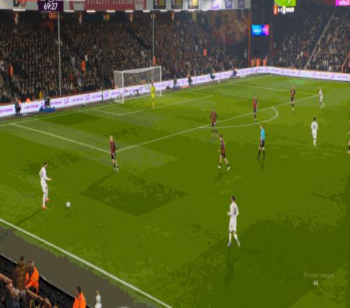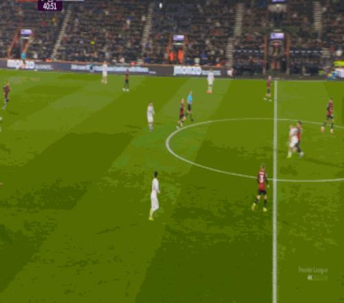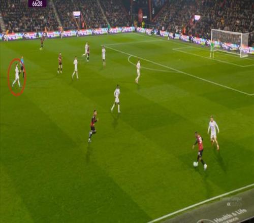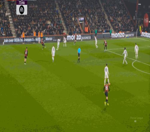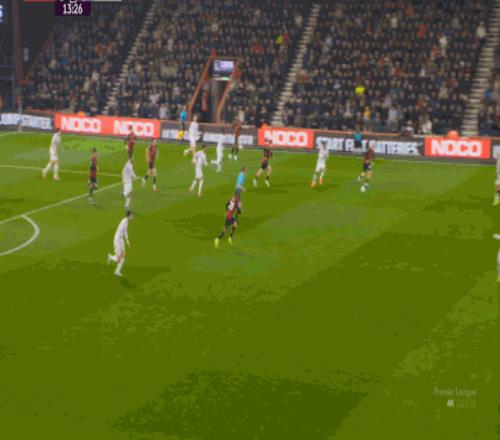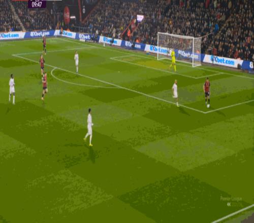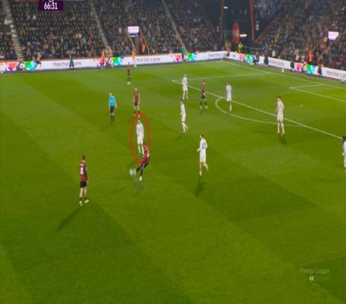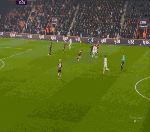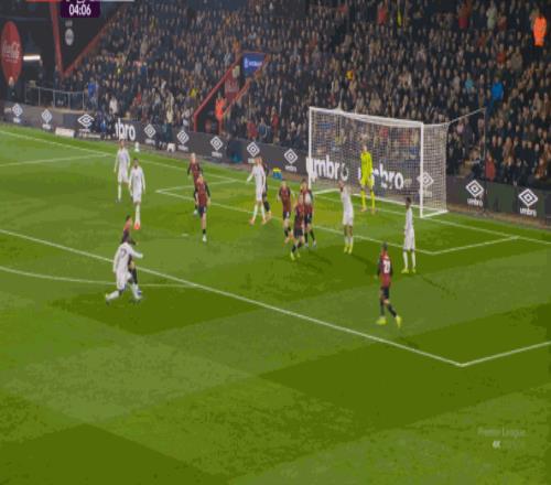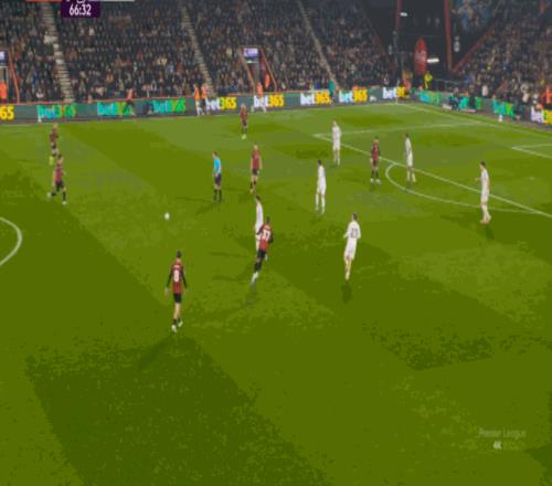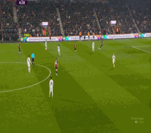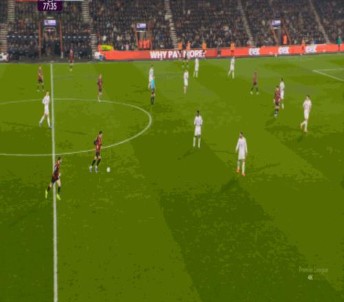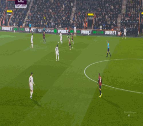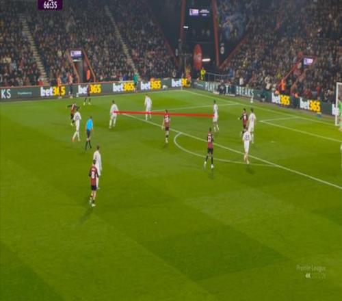 于是在这次转换中,伯恩茅斯击穿曼联的中路,随后从左路送上传中:
