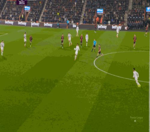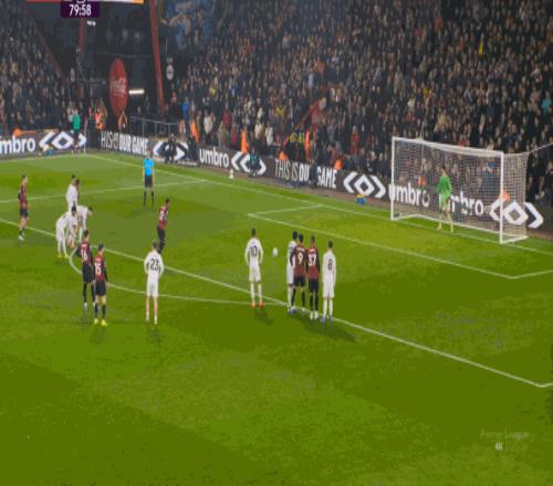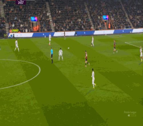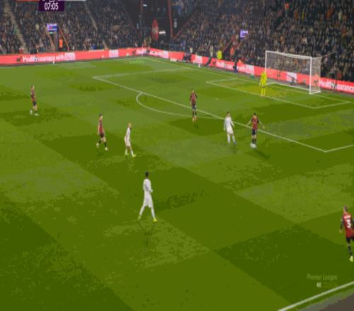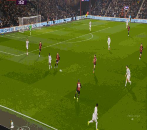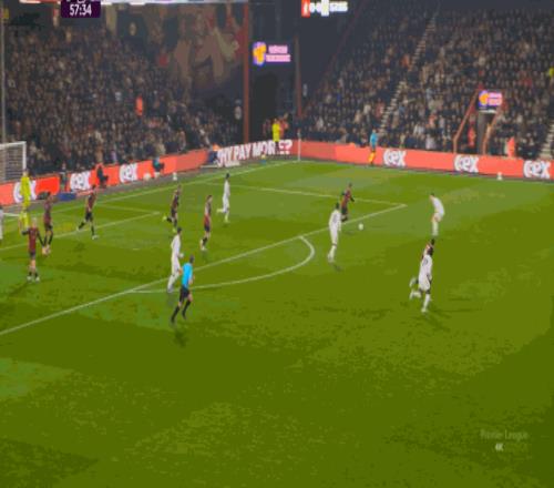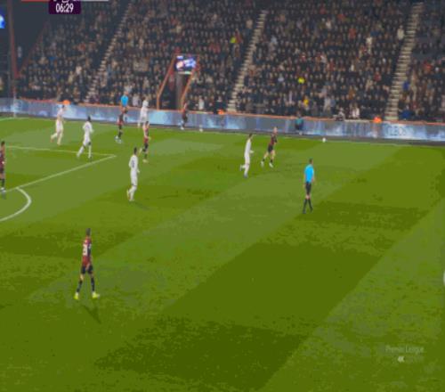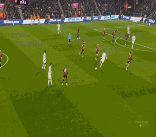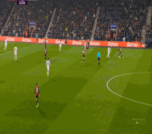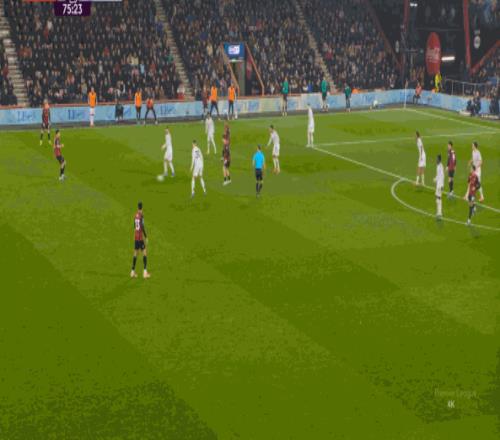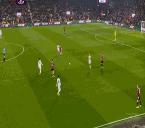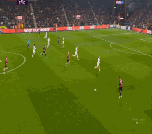 但整体来说,曼联还是占据了上风,并且形成了左右两路的优势局面,反观伯恩茅斯,在主场这个优势面前,只在22分钟前后打出了一波进攻,分别捕捉了布鲁诺和达洛特的失误,其余大部分时候都难有作为: