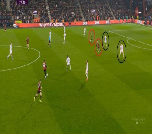 但伯恩茅斯顶住之后,打出反击,便抓到了曼联的中场空虚,直接形成了三打三: