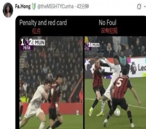 同样是拉人,一个连犯规都不算,一个直接红点套餐。曼联不仅被罚下一人,还眼睁睁看着比分被扳成2-2。少打一人+丢分,双重打击。
